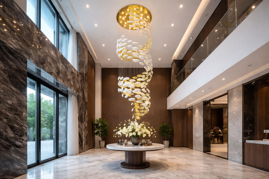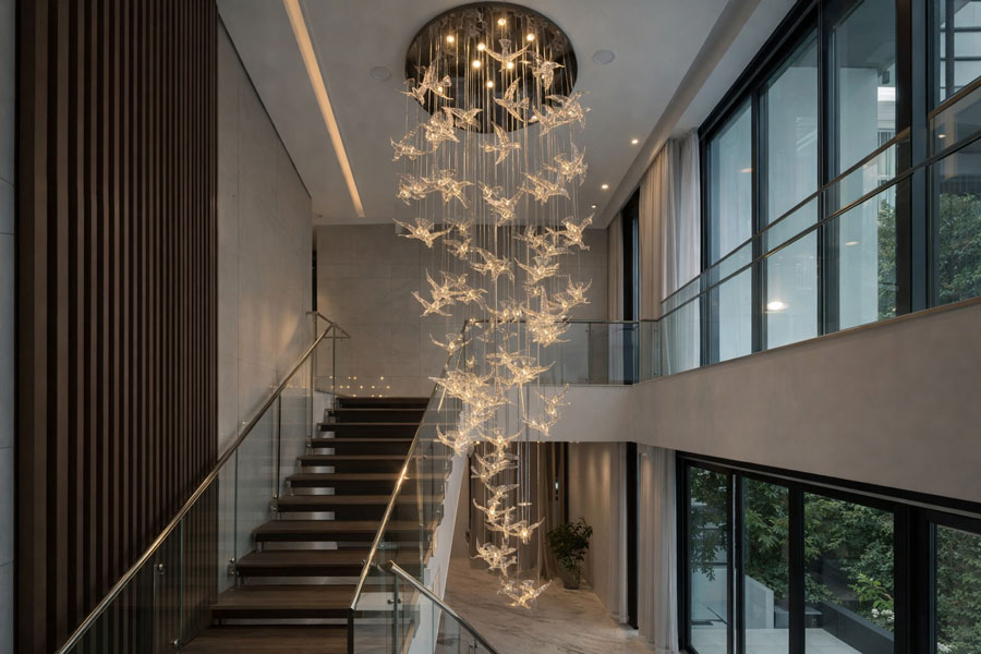 đèn chùm thả thông tầng