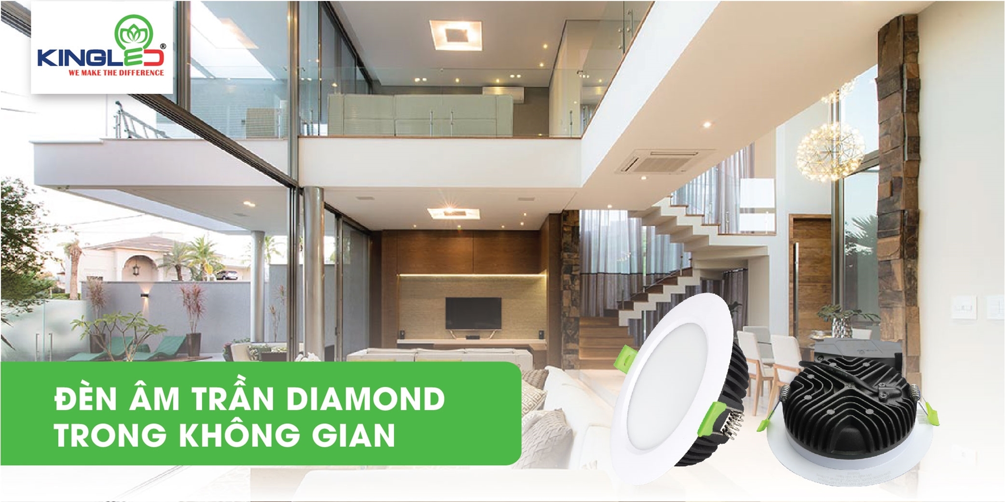 - Khái niệm: Âm trần Diamond là loại đèn led thuộc dòng đèn âm trần tán quang hay Downligt âm trần. Có hướng chiếu sáng từ trên xuống. Được lắp đặt vào trần nhà cho các kiểu trần thạch cao, trần gỗ.