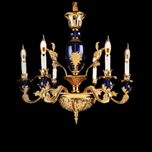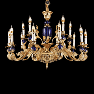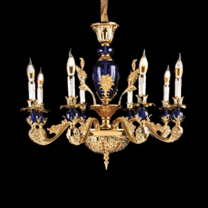 Đèn chùm DCD6066 gây ấn tượng mạnh bởi sự kết hợp hài hòa giữa sắc vàng óng ánh của đồng nguyên chất và điểm nhấn màu xanh lam đậm trên các chi tiết cầu kỳ. Các tay đèn được thiết kế uốn lượn mềm mại, mang cảm hứng từ những đường cong tự nhiên của lá cây, kết hợp với các họa tiết chạm khắc tinh xảo tạo nên một tổng thể hoàn hảo và đẳng cấp. Mỗi tay đèn đều được trang trí bằng những viên bi xanh biếc nổi bật, làm tăng thêm nét quý phái và sự cuốn hút cho chiếc đèn.