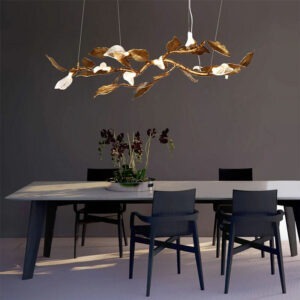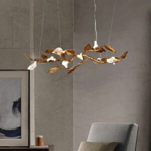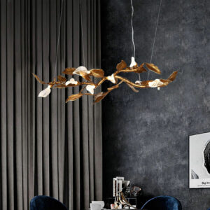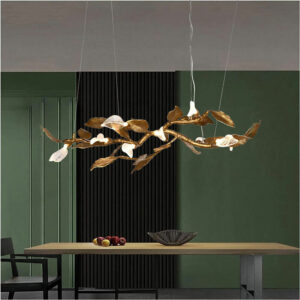 Đèn TPL-LP-2001N1200 được thiết kế với hình dáng như một cành cây uốn lượn nhẹ nhàng, gắn những chiếc lá bằng hợp kim ánh vàng đan xen cùng các chi tiết pha lê trắng tinh tế. Tổng thể như một nhành cây đang bung nở trong ánh sáng dịu nhẹ, vừa mộc mạc, gần gũi, vừa hiện đại, thanh lịch.