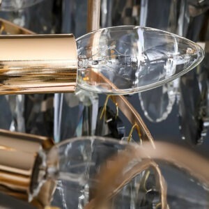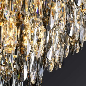 Điểm nổi bật của mẫu đèn chùm TPL 8173/600 chính là thiết kế hình chóp ngược được tạo thành từ nhiều tầng pha lê rủ xuống, mang lại cảm giác sang trọng, thanh thoát và quý phái. Các tinh thể pha lê được cắt vát dạng giọt nước, khúc xạ ánh sáng cực kỳ hiệu quả, tạo nên những dải sáng lung linh, huyền ảo như một dòng thác ánh sáng giữa không trung.