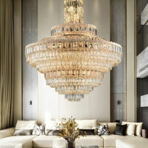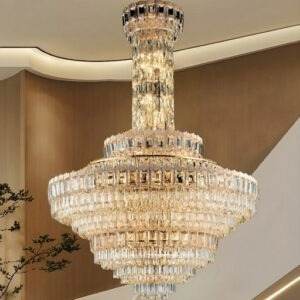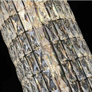 Phần thân đèn được bố trí theo dạng cột trụ pha lê kéo dài từ trần xuống, làm tăng chiều sâu và độ bề thế cho tổng thể đèn. Thiết kế này cực kỳ lý tưởng cho sảnh biệt thự thông tầng, đại sảnh khách sạn, trung tâm hội nghị hay những khu vực cần thể hiện sự trang trọng và quyền uy.