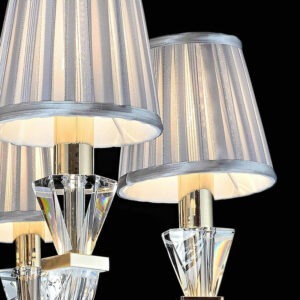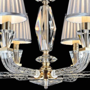 Đèn chùm pha lê DC8898T6 nổi bật với khung tay đèn được làm bằng pha lê trong suốt, bo cong mềm mại kết hợp cùng thân trục kim loại mạ vàng ánh kim cao cấp. Mỗi tay đèn được gắn một chụp vải sọc thanh lịch, tạo cảm giác ấm cúng, nhã nhặn mà vẫn giữ được tính hiện đại và sang trọng.