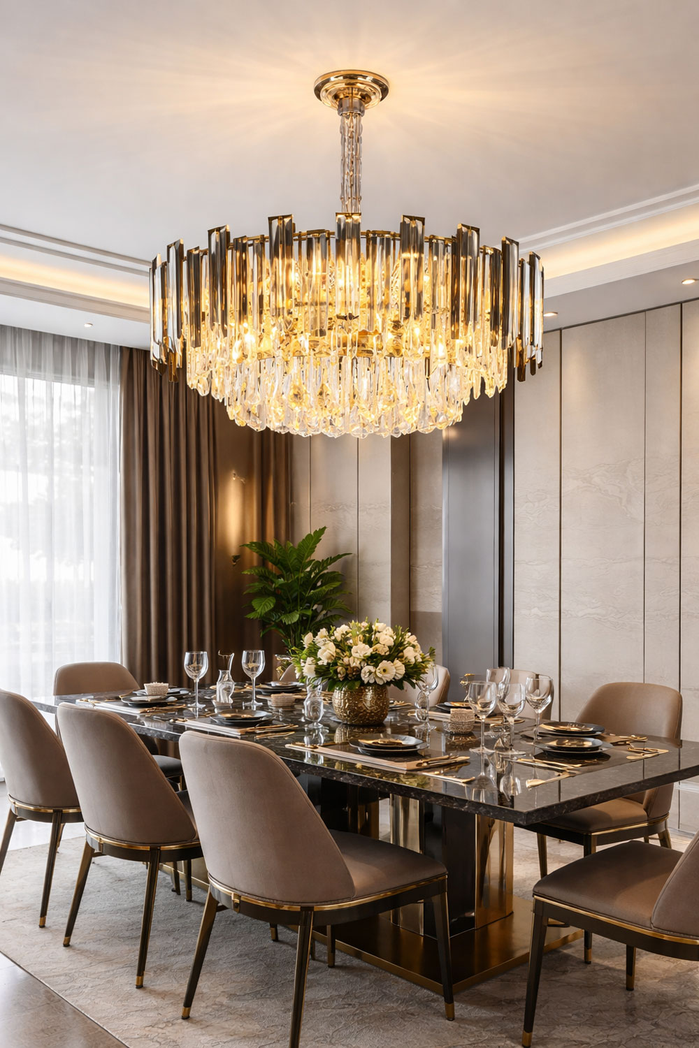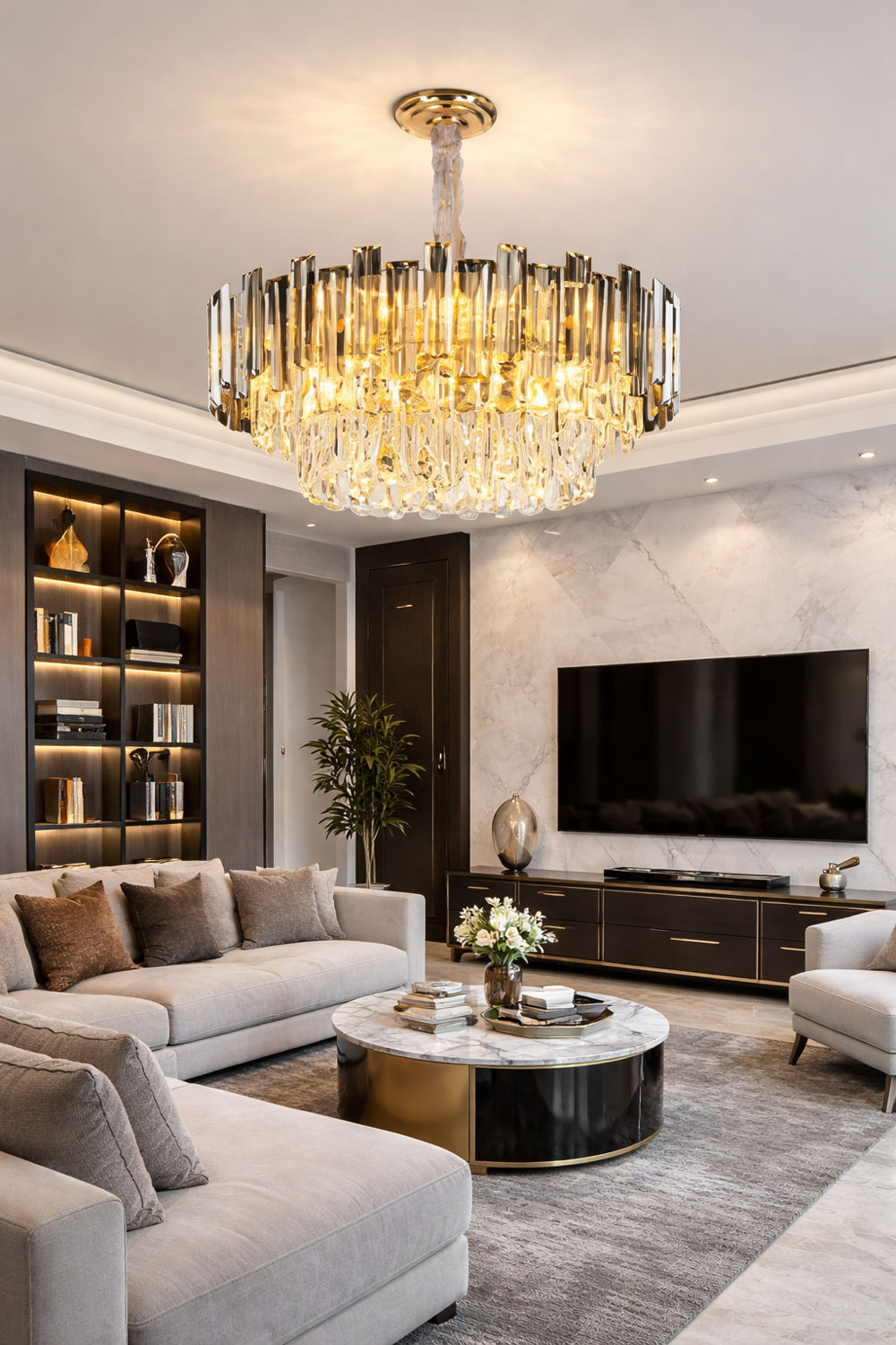 Phòng khách thượng lưu: Đóng vai trò là linh hồn của căn phòng, bộ đèn sẽ kết nối các món đồ nội thất như sofa, thảm trải sàn và tranh treo tường thành một tổng thể thống nhất và đẳng cấp.