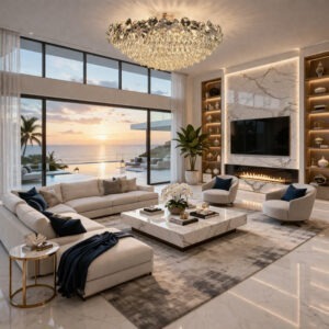 Phòng khách trần cao – tạo điểm nhấn trung tâm ánh sáng