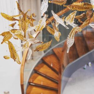Sản phẩm đèn chùm sảnh thông tầng trang trí cao cấp với một thiết kế vô cùng đơn giản nhưng cũng không kém phần tinh tế. Được lấy ý tưởng thiết kế từ cảm hứng thiên nhiên những chiêc lá pha lê kết hợp với ánh đèn sẽ tạo nên nguồn sáng vô cùng nghệ thuật. Bên cạnh đó, các nhà thiết kế như muốn gửi gắm tâm tư của mình, muốn đem thiên nhiên trở nên gần gũi hơn với không gian ngôi nhà.