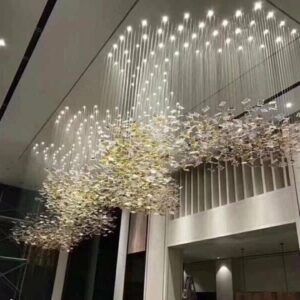 Sản phẩm đèn chùm sảnh thông tầng trang trí cao cấp với một thiết kế vô cùng đơn giản nhưng cũng không kém phần tinh tế. Được lấy ý tưởng thiết kế từ cảm hứng thiên nhiên những chiêc lá pha lê kết hợp với ánh đèn sẽ tạo nên nguồn sáng vô cùng nghệ thuật. Bên cạnh đó, các nhà thiết kế như muốn gửi gắm tâm tư của mình, muốn đem thiên nhiên trở nên gần gũi hơn với không gian ngôi nhà.