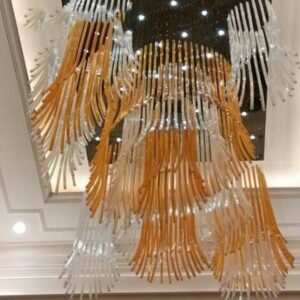Sản phẩm đèn chùm sảnh thông tầng trang trí cao cấp với một thiết kế vô cùng đơn giản nhưng cũng không kém phần tinh tế. Được lấy ý tưởng thiết kế từ cảm hứng thiên nhiên những chiêc lá pha lê kết hợp với ánh đèn sẽ tạo nên nguồn sáng vô cùng nghệ thuật. Bên cạnh đó, các nhà thiết kế như muốn gửi gắm tâm tư của mình, muốn đem thiên nhiên trở nên gần gũi hơn với không gian ngôi nhà.