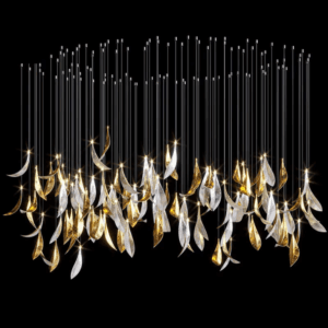 An An Decor tự hào giới thiệu tác phẩm đèn chùm thả trần thiết kế APL109, một kiệt tác ánh sáng mang đậm tính nghệ thuật và sang trọng. Lấy cảm hứng từ những chiếc lá vàng bay trong gió, thiết kế đèn thả trần này là sự kết hợp hoàn hảo giữa những mảnh pha lê tinh xảo với ánh sáng ấm áp.