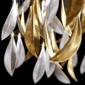 Với hơn 100 dây thả được bố trí ở các độ cao khác nhau, mỗi dây đèn được điểm xuyết bằng những chiếc lá pha lê mạ vàng và trắng tinh khiết. Các mảnh pha lê được chế tác thủ công tỉ mỉ, tạo nên hình dáng những cánh lá mềm mại, uyển chuyển như đang bay trong không gian.