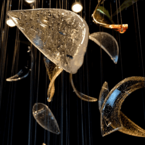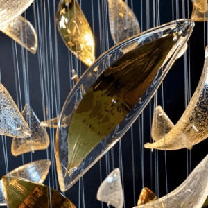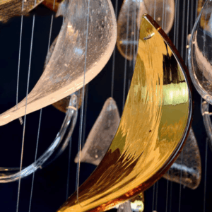 Mỗi thành phần thủy tinh đều được làm thủ công tỉ mỉ bằng kỹ thuật thổi thủy tinh truyền thống kết hợp với thiết kế sáng tạo. Các hình thức khác nhau về kích thước và hình dạng, từ hình lưỡi liềm tinh tế đến các phần đầy đủ hơn, quan trọng hơn, tăng thêm chiều sâu và sự thú vị về mặt thị giác cho bố cục tổng thể.