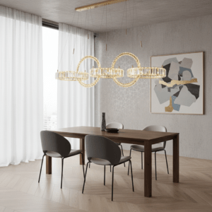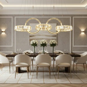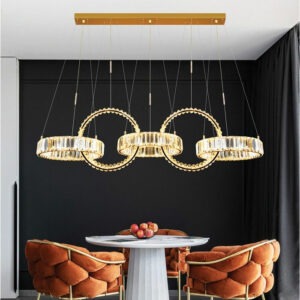 Đèn TPL-8607/5 gồm 5 vòng đèn pha lê được liên kết bằng các đường cong uyển chuyển, tạo cảm giác chuyển động nhẹ nhàng và hài hòa. Thiết kế này không chỉ giúp không gian thêm ấn tượng mà còn mang tính nghệ thuật cao, phù hợp với phong cách hiện đại, luxury và bán cổ điển.