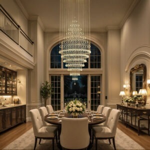 Thiết kế thả dài theo chiều dọc giúp đèn trở thành điểm nhấn trung tâm cho không gian thông tầng hoặc phòng khách trần cao. Khi nhìn từ trên xuống hoặc từ dưới lên, đèn tạo hiệu ứng thị giác rất ấn tượng, giúp không gian trở nên sang trọng và đẳng cấp hơn.