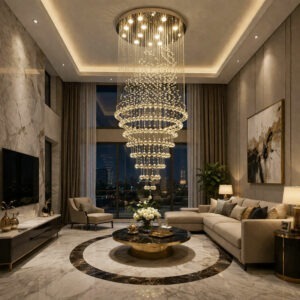 Thiết kế thả dài theo chiều dọc giúp đèn trở thành điểm nhấn trung tâm cho không gian thông tầng hoặc phòng khách trần cao. Khi nhìn từ trên xuống hoặc từ dưới lên, đèn tạo hiệu ứng thị giác rất ấn tượng, giúp không gian trở nên sang trọng và đẳng cấp hơn.