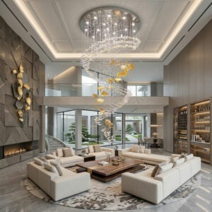 Đặc biệt, ánh sáng phản chiếu qua từng viên pha lê tạo nên hiệu ứng lung linh, khiến không gian như được “thắp sáng” theo phong cách nghệ thuật, rất phù hợp với phòng khách lớn, sảnh biệt thự hoặc khu vực cầu thang thông tầng.