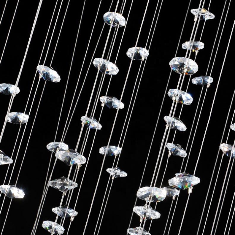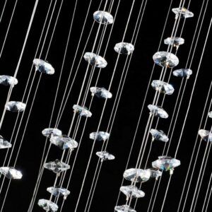 Đèn thông tầng FT 6882-12 sở hữu kiểu dáng thả dài nhiều tầng, tạo hiệu ứng ánh sáng rơi mềm mại như thác pha lê. Các chuỗi hạt pha lê được sắp xếp tỉ mỉ, phản chiếu ánh sáng đa chiều, mang lại vẻ đẹp lung linh và sang trọng.